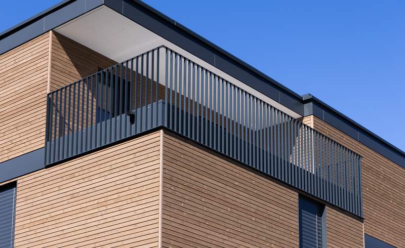 Für sämtliche Gebäude wurden hochwertige Liteline Geländer verwendet. Diese bestehen aus pulverbeschichtetem Aluminium in einem eleganten anthrazitgrau und fügen sich harmonisch in das Gesamtdesign ein. Verwendet wurden rechteckige Staketen für Balkon- und Attikageländer, die sowohl funktional als auch ästhetisch überzeugen.